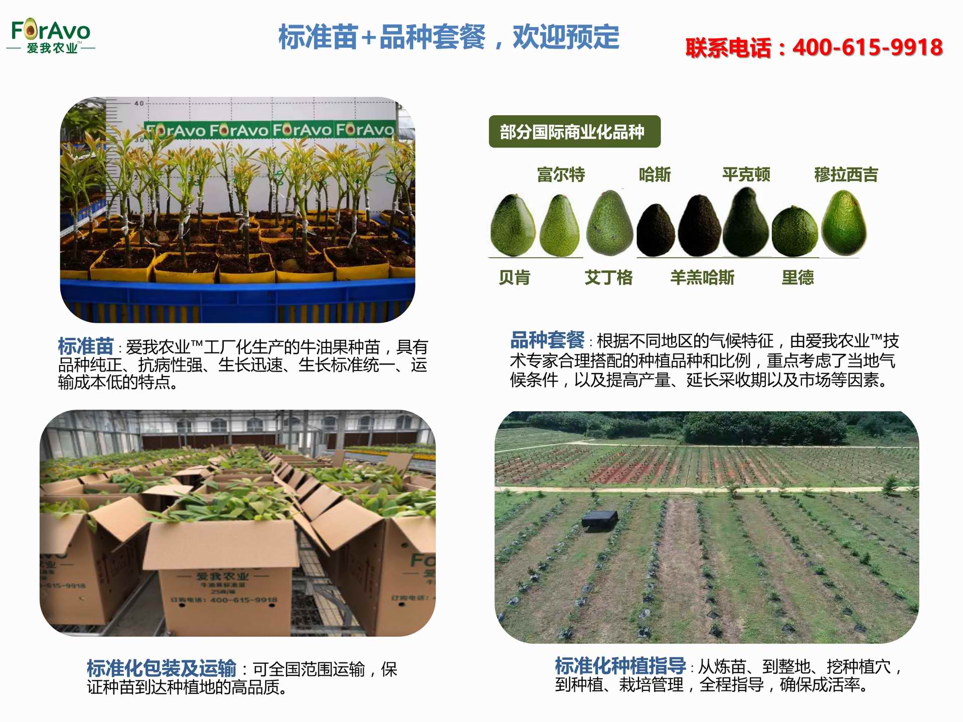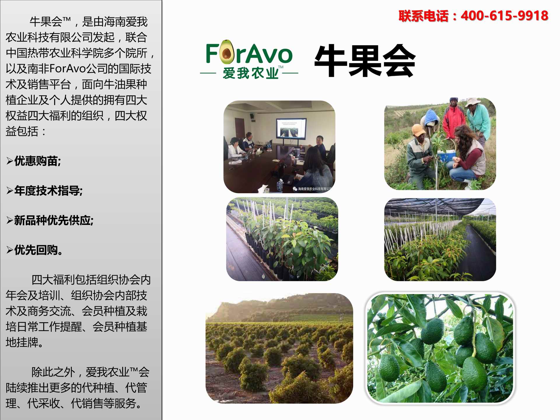 海南愛(ài)我農(nóng)業(yè)科技有限公司是一家綜合性的高科技農(nóng)業(yè)發(fā)展企業(yè),旗下愛(ài)我農(nóng)業(yè)TM致力于打造中國(guó)最大最強(qiáng)的牛油果種植企業(yè)。依托美國(guó)、南非、澳大利亞等擁有百年牛油果繁育、種植歷史以及產(chǎn)業(yè)鏈?zhǔn)袌?chǎng)的優(yōu)勢(shì),開(kāi)展牛油果種苗繁育、種植技術(shù),種植加盟、深加工等產(chǎn)業(yè)。結(jié)合中國(guó)市場(chǎng),面向廣大苗圃基地、種植農(nóng)場(chǎng)、合作加工等企業(yè),推出的適合規(guī)?;?、標(biāo)準(zhǔn)化的牛油果全產(chǎn)業(yè)鏈服務(wù)。 Hainan Foravo Agricultural Technology Co., Ltd. is a comprehensive high-tech agricultural development enterprise , dedicated to building the largest and most powerful avocado plantation enterprise in China. Relying on the advantage of avocado nursery, planting history, and the industrial chain over 100 years in the United States, South Africa, Australia, we are carrying out nursery, planting, proce...